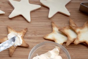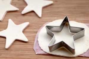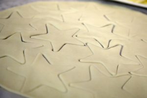 Con ayuda de un cortador en forma de estrella corta la masa y coloca las estrellas en una fuente cubierta con papel vegetal. Hornea durante 15 minutos a 180º o hasta que comiencen a dorarse.