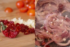 Ahora lamina la cebolla roja, parte a la mitad los cherry y las aceitunas y pica muy menudito ajo y el peperoncino.