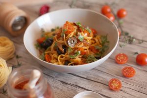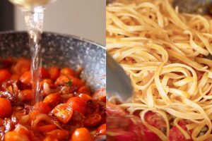 Para preparar este suculento plato de pasta a la putanesca, comienza por poner abundante agua a hervir. Cuando esté en el punto más alto de ebullición añade sal, la hoja de laurel para perfumarla y sumerge los fetuccini. Mueve con una pala el primer minuto y después deja que la pasta baile dentro del agua. Pasado el tiempo que marque el fabricante escurre y reserva. Guarda siempre un poco de agua de la cocción ya que te puede servir para darle un punto más de jugosidad al plato.