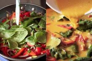 Añade dos cucharadas de cebolla caramelizada, unas hojas de albahaca partida, los tomates cherry y las espinacas baby. Apaga el fuego y deja que el calor marchite ligeramente los últimos ingredientes.