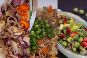 Cuando estén brillantes y comiencen a desprender un rico aroma, vuelca los guisantes, salpimienta al gusto y mantén a fuego medio durante 3 minutos más para que todos los sabores se fusionen. Si te gustan más jugosos o con algo de caldo puedes añadir agua de la cocción. Presenta con unos pequeños aros de cebolleta, unas hojitas de menta, y unos refrescantes dados de fresa.