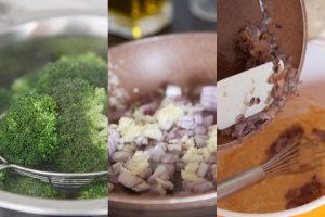 Agrega el brocoli sin los tallos, solo la parte tierna y aplasta con un tenedor o un potato masher hasta conseguir una masa tosca.