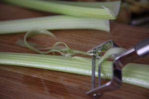 Lava, pela y troceada las patatas en pedazos pequeños. Retira las hojas del apio y con ayuda de un pelador elimina las hebras de todo el tallo y córtalos en trocitos pequeños.