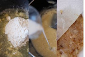 Vierte un poco de leche y remueve hasta que esté completamente integrada, continúa agregando leche poco a poco hasta conseguir una bechamel ligeramente espesa. Transfiere a un bol y deja unos minutos para que temple.