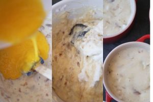 Agrega la cebolla a la bechamel, el queso rallado, las anchoas cortadas en pequeños pedacitos y revuelve para integrar. Bate las yemas, vierte por encima y nuevamente mezclar para integrar.
