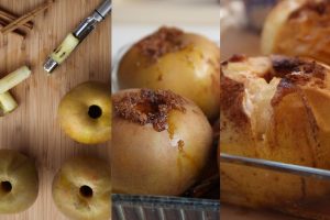 Combina el azúcar con la canela en polvo y vuelca una cucharadita en cada orificio de la manzana. Vierte el brandy, el agua por encima, coloca la ramita de canela en la fuente y hornea a 170º durante 25-30 minutos, dependiendo del tamaño de la manzana. Pasados los primeros 15 minutos retira la fuente del horno y cúbrela con papel de aluminio para que se hagan por igual y evitar que se quemen.