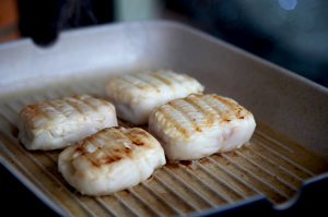 Sazona la merluza y cocina en una sartén parrillada con aceite de oliva y mantequilla durante 2-3 minutos por cada lado.