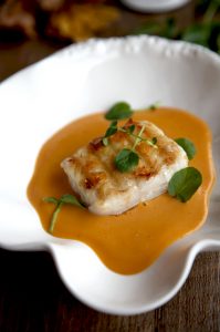 Presenta la merluza sobre la velouté y decora con unas pequeñas hojas de berro.
