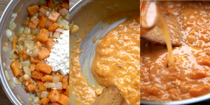 En una sartén o cazuela baja calienta el aceite de oliva junto a una cucharada de mantequilla. Añade la cebolla, los ajos, la calabaza y cocina suavemente a fuego medio durante unos minutos. Cuando obtengas un aspecto blandito y brillante pon la harina y fríe todo junto sin parar de remover durante un minuto.