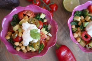 Corta en dados el aguacate, el pimiento rojo, la cebolleta y en cuartos los tomates cherry. Transfiere todo a la fuente de los garbanzos y completa con las pipas de calabaza y las rodajas de jalapeños.