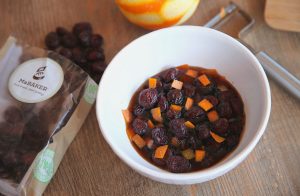 Corta en pequeños dados la piel de media naranja y ponla a macerar con el vino Moscato en un lugar cálido junto a los arándanos deshidratados orgánicos durante 30 minutos.