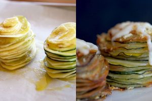 Pela la berenjena, la patata y haz con ellas finas rodajas con ayuda de la mandolina.Extiende los tres ingredientes, pulveriza aceite de oliva sobre ellos y sazona. Monta dos milhojas con patata y berenjena y otros dos milhojas combinando el calabacín y la patata.Hornea a 140º durante 45-50 minutos.