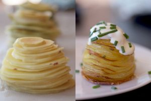 Con ayuda de una mandolina corta una patata en rodajas muy finas -casi como un folio-Extiéndelas sobre una fuente, sazona al gusto, pulveriza por todas ellas un buen aceite de oliva virgen extra y móntala de nuevo dejando la rodaja de mayor diámetro como base.
