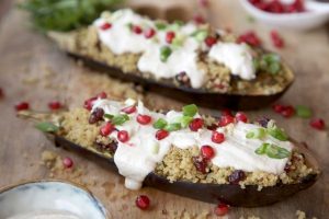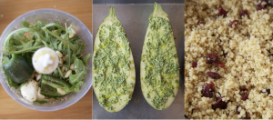 Mientras se asan las berenjenas prepara la quinoa: en una cazuela pon a calentar dos tazas de caldo, lava bien la quinoa y añádela. Cuando esté en su punto más alto de ebullición baja la intensidad del fuego y cocina hasta que el liquido evapore. En el último minuto incorpora las uvas pasas y revuelve.