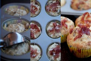 Coloca unas tiras de jamón ibérico por encima e introduce tus muffins en el horno precalentado a 170º durante 25 minutos. Como cada horno es un mundo comprueba que están terminados pinchando un palito de brocheta, éste debe salir limpio.
