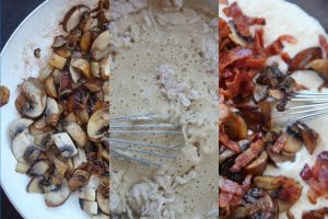 Ahora haz un hueco en los ingredientes secos y vierte los húmedos. Mezcla ligeramente y solo hasta que los ingredientes secos hayan quedado humedecidos y te quede una masa grumosa. No busques una masa lisa, ya que si te excedes al mezclar, obtendrás unos muffins de setas y becon demasiado densos.