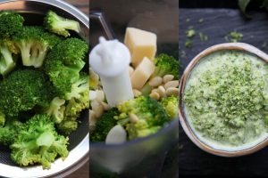 Corta y lava el brócoli en pequeños ramilletes. Calienta agua en una cazuela con media cucharada de sal y cocina el brócoli durante 2 minutos. Cuela y reserva el agua.