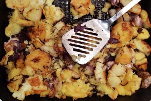 Para preparar las patatas, retira la piel y pártelas en trozos grandes. Pon a hervir agua con sal y cuece las patatas durante 15 minutos. Escurre, deja templar durante dos minutos para que sequen y transfiérelas después a una fuente de horno.Derrite la mantequilla con el aceite y pincela las patatas. Esparce los dientes de ajo enteros sin pelar, las hojas de tomillo, la cebolla roja laminada, sazona al gusto y hornea durante 35 minutos a 180º. Cinco minutos antes saca la fuente del horno, voltea las patatas y aplástalas con un tenedor, vuelve a pincelar con la mantequilla y el aceite e introduce de nuevo en el horno, pero esta vez enciende el grill para que se doren bien.