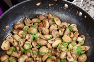 Para preparar los champiñones, pica muy menudito los ajos y dóralos en una sartén con un par de cucharadas de aceite de oliva. Incorpora los champiñones cortados por la mitad y cocina hasta que se tornen dorados y algunos lados se tuesten ligeramente. Ve desechando el agua que sueltan para que no se cuezan y queden bien fritos.
