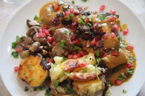 Presenta el osobuco con las patatas, los champiñones, su salsita y decora con la granada y perejil fresco recién cortado.