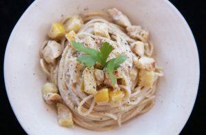 Calienta una sartén con cuatro cucharadas de aceite de oliva y rehógalos suavemente. Cuando comiencen a estar dorados y tiernos vierte la leche de coco y deja que tome temperatura. Incorpora la pasta y remueve para que se impregne de estos deliciosos sabores. Para que queden más jugosos añade media taza de agua de la cocción.