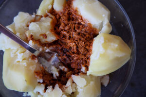 En una sartén pequeña calienta una capa de medio centímetro de aceite de oliva y fríe los ajos rallados. Cuando comiencen a dorar añade el pimentón dulce, el picante y remueve durante unos 10-15 segundos. Vuelva el resultado sobre las patatas y machaca hasta conseguir integrar perfectamente todos los ingredientes.
