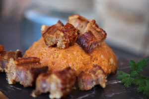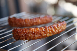 Dispón las tiras de tocino en una rejilla y coloca una fuente de horno debajo para que recoger la grasa que vaya soltando. Introduce ambas en el horno precalentado a 150º durante durante una hora. Pasados los primeros 50 minutos, voltea e hidrata con aceite de oliva todo el torrezno. Sube la intensidad a 190º para que la corteza hinche y se vuelva crujiente.