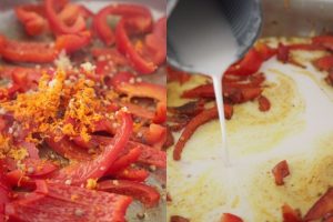 En la misma cazuela suaviza el pimiento morrón rojo cortado en tiras durante un par de minutos. Incorpora el jengibre, la cúrcuma rallada, la pasta de curry rojo, las semillas de cilantro, las cayenas partidas para ese toque picante y remueve un minuto para integrar.
