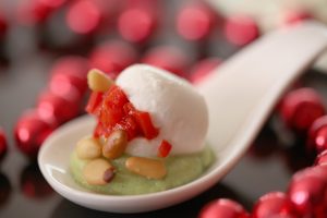 Sobre unas cucharitas de aperitivo (también podéis utilizar cucharillas desechables) haz una base con la crema de aguacate y albahaca. Rellena las perlas de mozzarella con los pimientos de piquillo partiditos y coloca encima los piñones tostados.