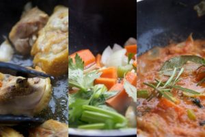 En la misma sartén suaviza durante diez minutos la cebolla, el apio, la zanahoria, dos dientes más de ajo machacados, los copos de chile, si deseas el punto picante y la hoja de laurel. Sazona al gusto.