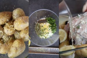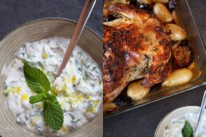 Distribuye las patatas en una fuente de horno con los limones cortados en rodajas, las aceitunas de Kalamata y los dientes de ajo enteros que te quedan. Coloca el pollo encima, vierte el caldo y hornea a 170º durante 1h 20’. En los últimos 10 minutos sube los grados a 200 para tostar la piel.Como verás el limón está muy presente en esta receta, pero no te preocupes porque el resultado no será nada ácido, ya que al cocinarse su sabor se suaviza. Prepara una salsa para acompañar utilizando el resto del yogurt, unas hojas de menta, perejil picadito, un diente de ajo prensado, sal al gusto y más ralladura de limón.