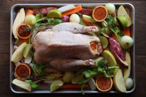 Escoge la fuente más grande que tengas para hornearlo. Coloca el pollo entero en el medio y distribuye todos los ingredientes cortados alrededor. Procura que no se monten mucho unos encima de otros y asegúrate de que tengan espacio para que cuando reduzcan su tamaño por el tiempo de cocinado se acomoden suavemente en la bandeja.Funde la mantequilla con el aceite de oliva y pincela todos los componentes. Añade sal, deja caer las hojas de tomillo y vierte el vino en el fondo.Hornea a 180º durante hora y media aproximadamente. Cuando observes que la piel ya tiene un bonito color dorado, saca la fuente del horno y cubre con papel de aluminio después introduce de nuevo en el horno hasta completar el tiempo.