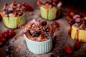Cuando el pudín haya templado espolvorea azúcar glass, pincela con la mermelada y decora con los frutos secos tostados y crujientes.