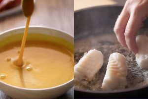 ¡Ahora vamos hacer la suave salsa de azafrán!En una cazuela pon una fina cama de aceite de oliva y rehoga las cebolletas cortada en finas láminas. Cuando este brillante y tierna salpimienta al gusto, espolvorea una cucharada de harina y fríela durante un par de minutos sin parar de remover. Seguidamente añade las hebras de azafrán y por último vierte el líquido del rape poco a poco hasta que la salsa comience a ligar y espese. Rome con los dedos los filamentos del azafrán e incorpora, rápidamente éstos se hidratarán y empezarán a perfumar y dar color a tu salsa. Apaga el fuego y mantén en la fuente de calor un par de minutos removiendo suave y constantemente. Vuelca el resultado en un vaso batidor y tritura hasta conseguir una cremita homogénea.