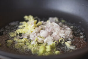 Prepara la salsa de cítricos. Pica en pequeños daditos la chalota, el jengibre y la citronella. Rehoga todo junto en una sartén con el aceite y la mantequilla.
