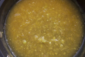 Después añade la harina de maíz y tuéstala suavemente durante un minuto removiendo constantemente.Exprime las naranjas, la lima, la mandarina, e incorporar todo el zumo poco a poco a la sartén removiendo para integrar y por último el vino moscatel. Mantén en el fuego 2 o 3 minutos más y reserva.