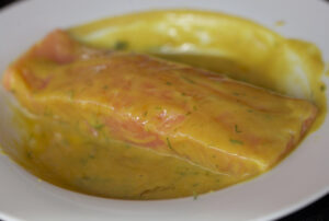 En un plato mezcla la mostaza, con la miel, el eneldo picadito e impregna por todos loslados los lomos de salmón.