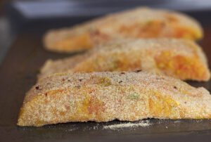 En otro plato combina unos copos de chile al gusto junto al pan rallado y reboza en él los lomos de salmón.Pincela una fuente de horno con aceite de oliva, coloca los lomos, pasa el pimentero por encima de ellos y hornea durante 15 minutos a 180º