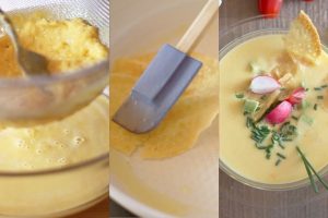 Presenta esta refrescante sopa fría de maíz en un recipiente con el aguacate, los cherry, el crujiente queso y una lluvia de cebollino picado.