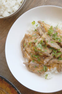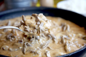 Incorpora la crema de nata, el tomate concentrado y revuelve para integrar perfectamente -en caso de no tener tomate concentrado puedes usar tomate frito o en su defecto ralladura de tomate rojo fresco-Vierte el caldo de ave junto a la leche evaporada, sube la intensidad del fuego dejando que vuelva a tomar temperatura y comience a burbujear. Transfiere la carne e integra revolviendo suavemente. Prueba,ajusta la sazón y cocina 4 o 5 minutos más cubriendo la sartén con una tapadera. Pasado el tiempo comprueba que la carne está tierna, de no estarlo, mantén más minutos en el fuego. Presenta tú stroganoff de ternera sobre una cama de arroz blanco, puré de patata, ensalada, pasta opatatas fritas.