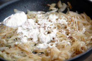 Espolvorea la harina por encima y mezcla muy bien durante uno o dos minutos para que se fría.