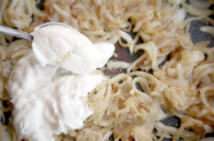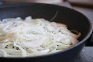 Agrega 3 cucharadas de aceite en la misma sartén donde preparaste la carne, vuelca la cebolla y cocina a fuego medio bajo hasta que comience a dorarse. Salpimienta al gusto.