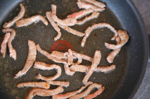 Corta los filetes de ternera en tiras muy finas de unos 5-6 cm de largo y 1 cm de grosor aproximadamente.
