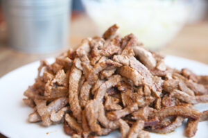 Una vez tengas toda la carne lista reserva en un plato y corta la cebolla en láminas muy finas.