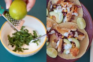 Calienta las tortillas y monta tu taco poniendo primero las verduras, después el aguacate cortado en gajos, unos granos de maíz esparcidos, unas hojas de cilantro, el pescado y termina con la salsa.