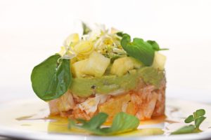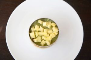 Para presentar este plato ayúdate de un aro de cocina. Comienza con un par de cucharadas de la mezcla de pescado y piña, presionando suavemente para que quede compacto. Continúa con una cucharada de guacamole y otra de piña.