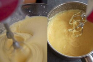 Incorpora poco a poco la mezcla de las yemas a la leche sin dejar de batir y hasta observar una crema espesa (aproximadamente 5 minutos).Cubre la crema pastelera con plástico de cocina presionando suavemente para evitar que se haga costra y deja enfriar de 1 a 2 horas. Una vez fría comprobarás que se ha formado una pasta compacta y densa. No te preocupes, vuelve a batir con unas varillas, -como te comenté anteriormente- y recuperar así la textura de una crema suave. Seguido introduce el resultado en la manga pastelera para una mejor dosificación. Reserva en un lugar fresco hasta su uso.