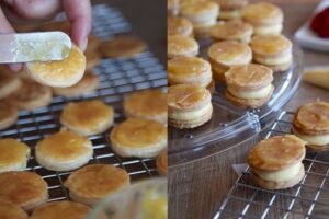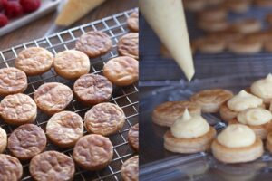 Coloca encima de cada circulo de hojaldre una cantidad generosa de crema pastelera.