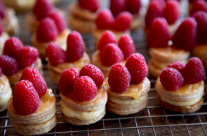 Coloca el hojaldre untado con crema de limón sobre la crema pastelera ejerciendo una ligera presión para ajustarlo bien. Es importante que si en tu cocina hace calor, introduzcas los pastelitos en la nevera para que la crema enfríe y no se escurra cuando pongas las frambuesas.