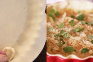 Después añade la cebolla confitada, un poquito de queso rallado y unas hojas frescas de orégano o en su defecto la especia.